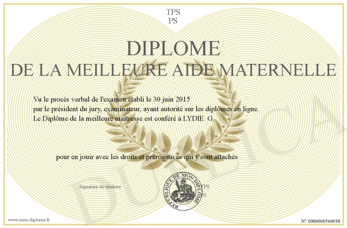 Envoyez par email votre Diplôme de la Meilleure Aide Maternelle personalisé