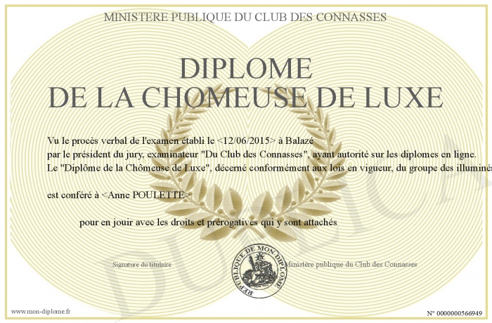 Envoyez par email votre Diplôme de la Chômeuse de Luxe personalisé