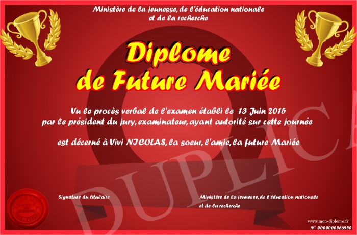 Envoyez par email votre Diplome de Future Mariée personalisé