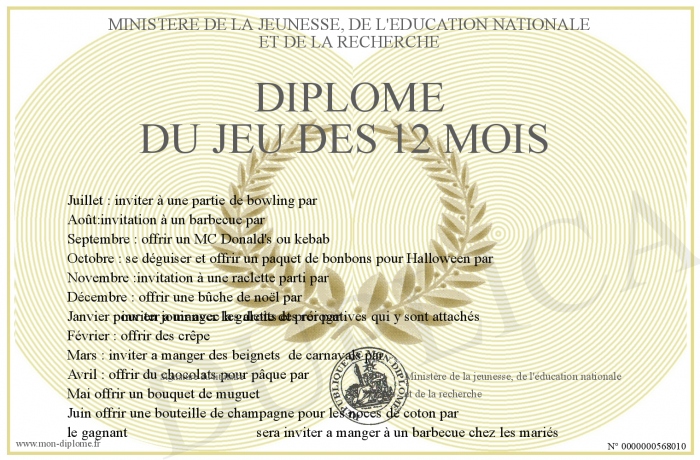 Envoyez par email votre Diplôme du jeu des 12 mois personalisé