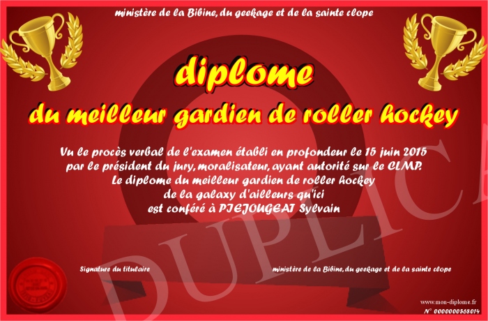 Envoyez par email votre diplome du meilleur gardien de roller hockey personalisé