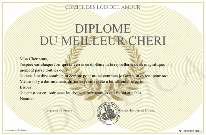 Envoyez par email votre Diplôme du Meilleur Chéri personalisé
