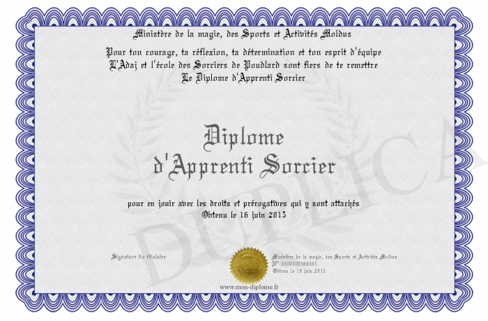 Envoyez par email votre Diplôme d'Apprenti Sorcier personalisé