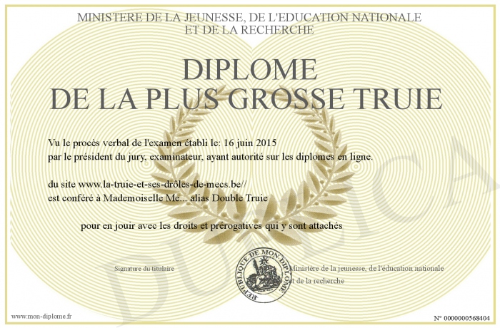 Envoyez par email votre Diplôme de la plus grosse truie personalisé