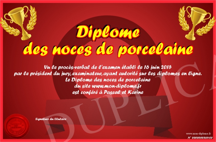 Envoyez par email votre Diplôme des noces de porcelaine personalisé