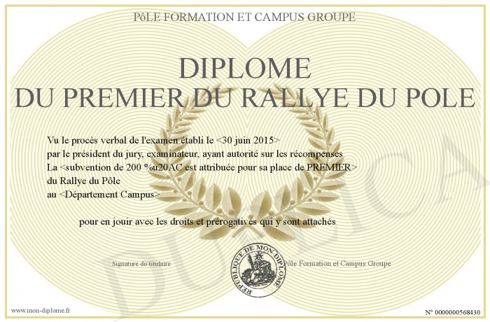 Envoyez par email votre Diplome du PREMIER du RALLYE DU POLE personalisé