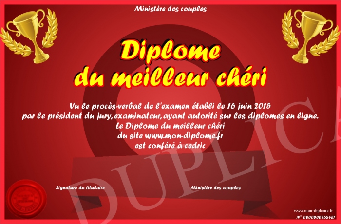 Envoyez par email votre Diplôme du meilleur chéri personalisé