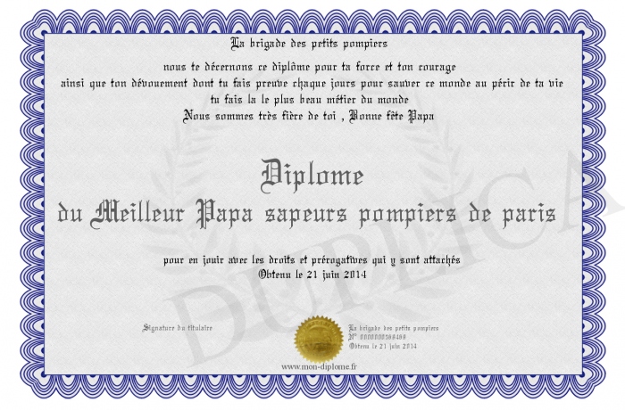 Envoyez par email votre Diplôme du Meilleur Papa sapeurs pompiers de paris personalisé