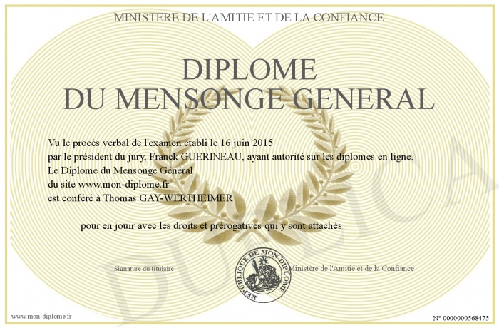 Envoyez par email votre Diplôme du Mensonge Général personalisé