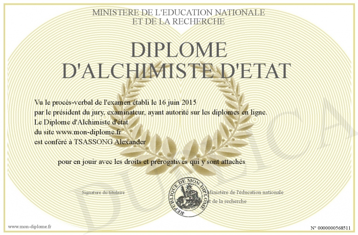 Envoyez par email votre Diplôme d'Alchimiste d'état personalisé