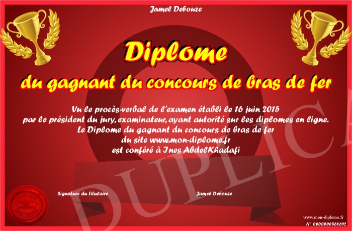 Envoyez par email votre Diplôme du gagnant du concours de bras de fer personalisé