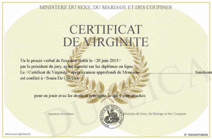 Envoyez par email votre Certificat de Virginité personalisé