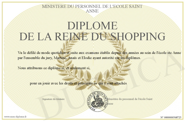 Envoyez par email votre Diplôme de la Reine du Shopping personalisé