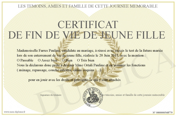 Envoyez par email votre Certificat de fin de vie de jeune fille personalisé