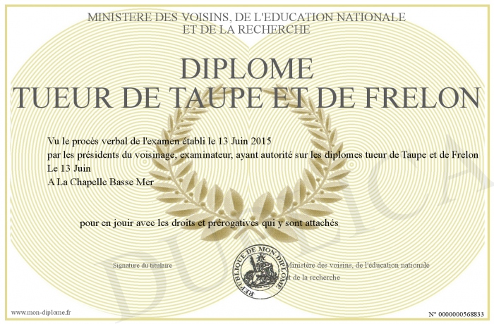 Envoyez par email votre Diplôme tueur de Taupe et de frelon personalisé