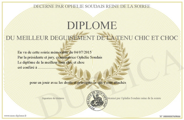 Envoyez par email votre Diplôme du meilleur déguisement de la tenu chic et choc personalisé