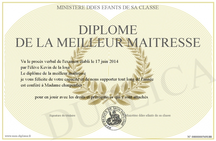 Envoyez par email votre Diplôme de la meilleur maitresse personalisé