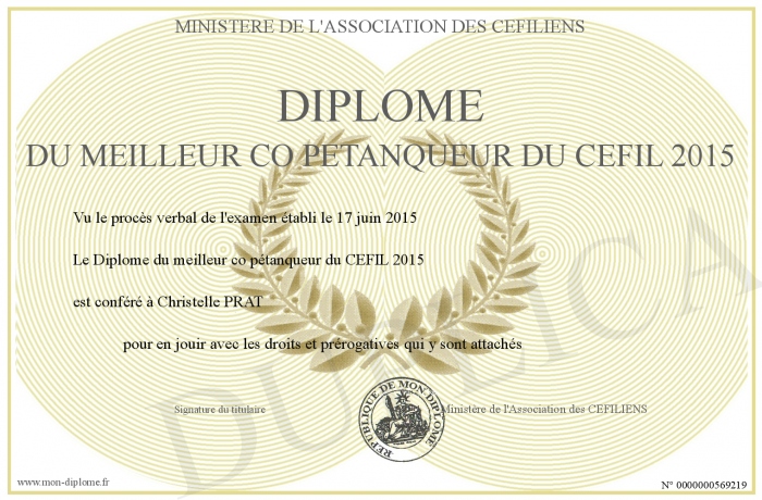 Envoyez par email votre Diplôme du meilleur co pétanqueur du CEFIL 2015 personalisé