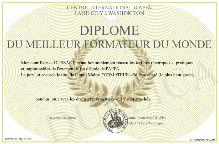 Envoyez par email votre Diplôme du meilleur formateur du monde personalisé