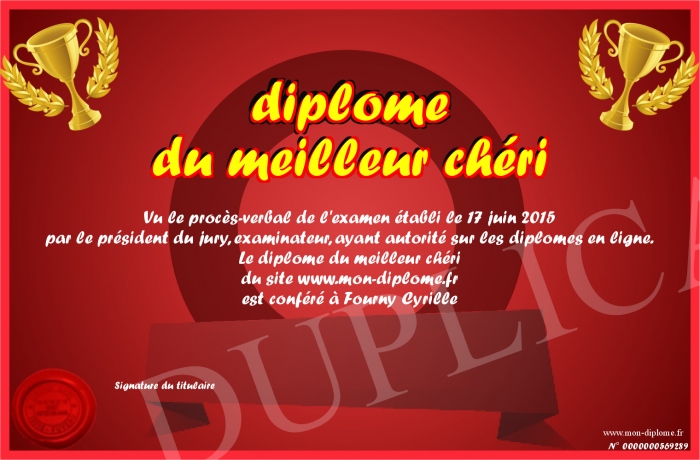 Envoyez par email votre diplôme du meilleur chéri personalisé