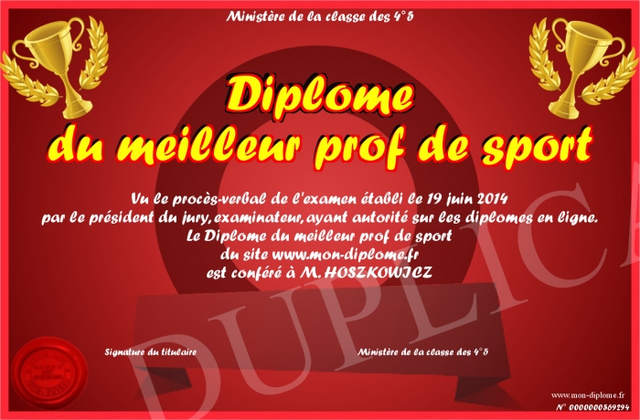 Envoyez par email votre Diplôme du meilleur prof de sport personalisé
