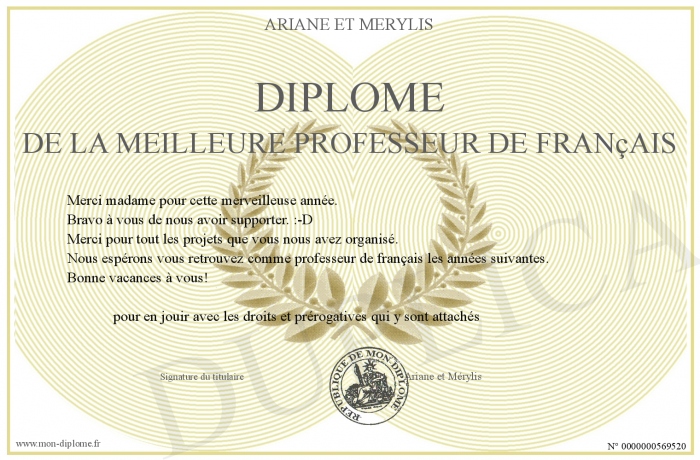 Envoyez par email votre Diplôme de la meilleure professeur de Français personalisé