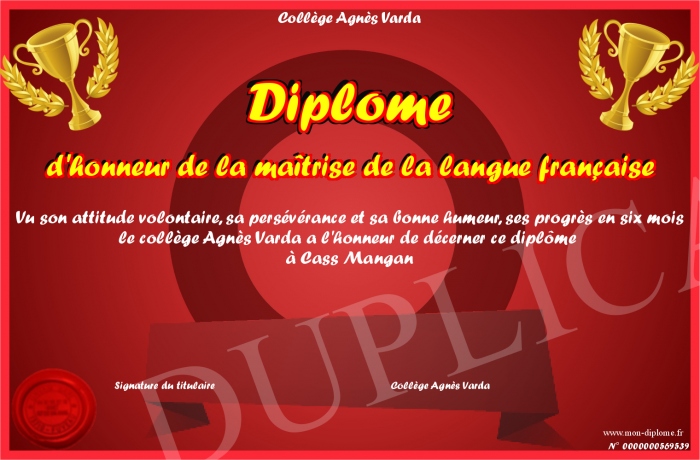 Envoyez par email votre Diplôme d'honneur de la maîtrise de la langue française personalisé