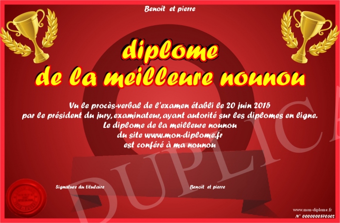 Envoyez par email votre diplôme de la meilleure nounou personalisé