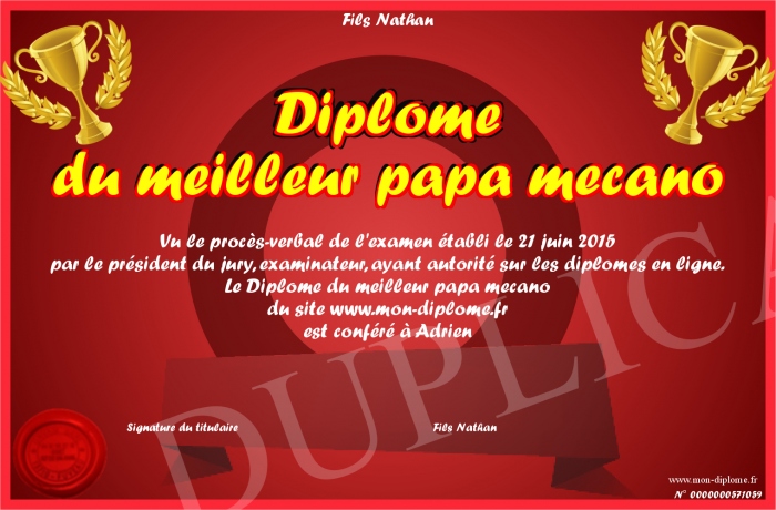 Envoyez par email votre Diplôme du meilleur papa mecano personalisé