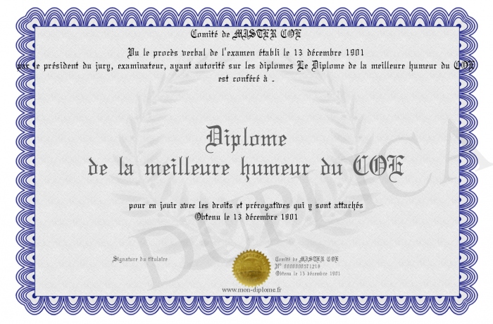Envoyez par email votre Diplôme de la meilleure humeur du COE personalisé