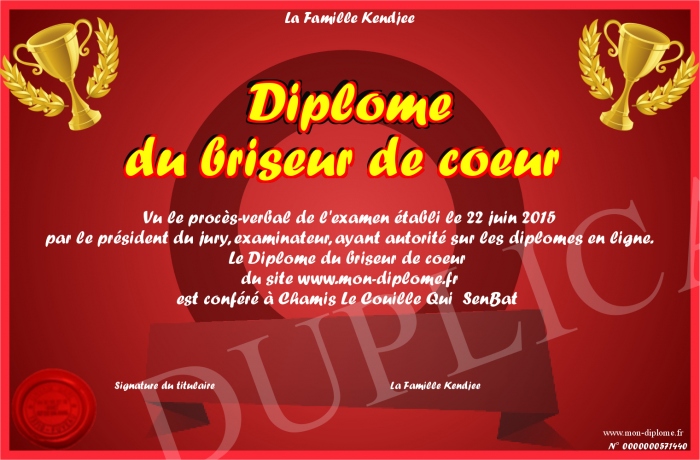 Envoyez par email votre Diplôme du briseur de coeur personalisé