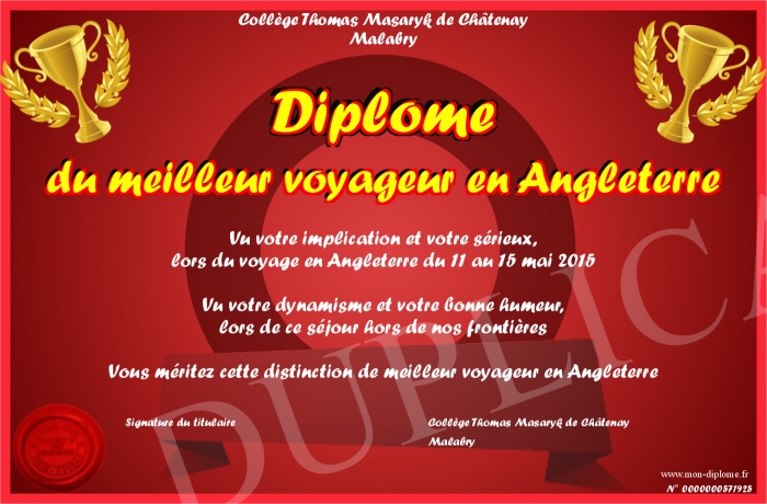 Envoyez par email votre Diplôme du meilleur voyageur en Angleterre personalisé