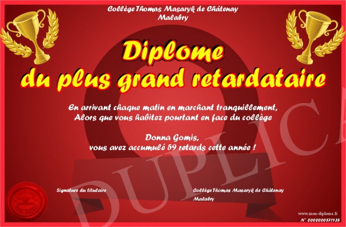 Envoyez par email votre Diplôme du plus grand retardataire personalisé