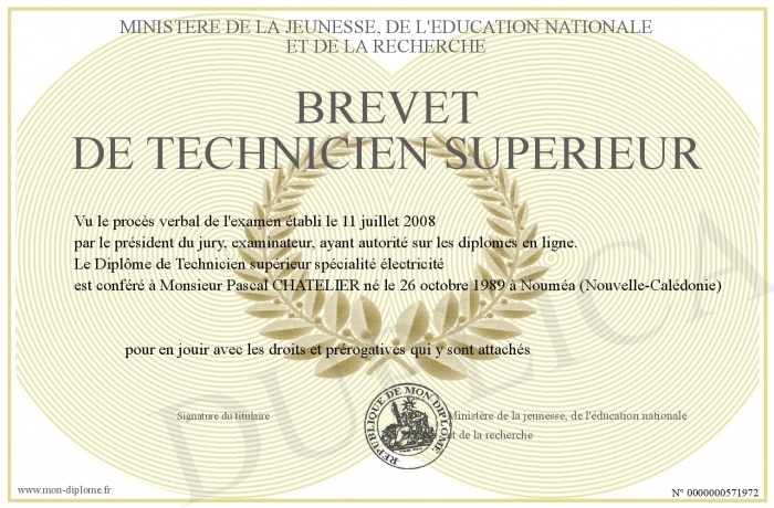 Envoyez par email votre Brevet de Technicien supérieur personalisé