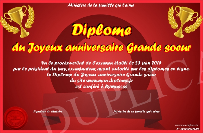 Envoyez par email votre Diplôme du Joyeux anniversaire Grande soeur personalisé