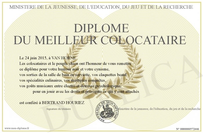 Envoyez par email votre Diplôme du meilleur colocataire personalisé