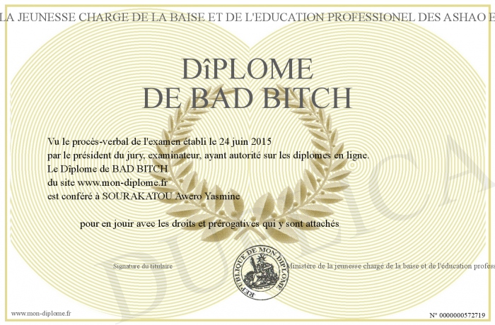 Envoyez par email votre Dîplome de BAD BITCH personalisé