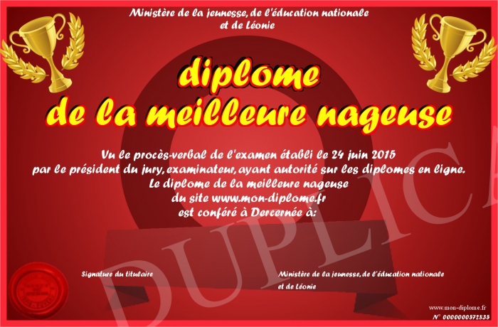 Envoyez par email votre diplome de la meilleure nageuse personalisé