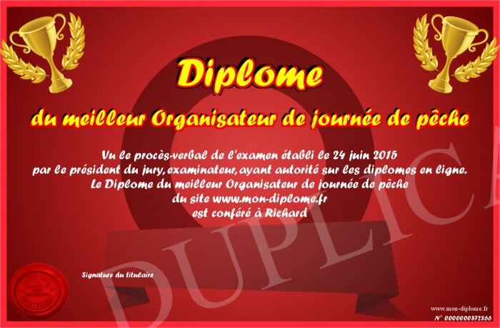 Envoyez par email votre Diplôme du meilleur Organisateur de journée de pêche personalisé