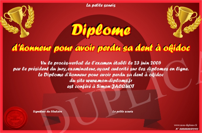 Envoyez par email votre Diplôme d'honneur pour avoir perdu sa dent à okidoc personalisé