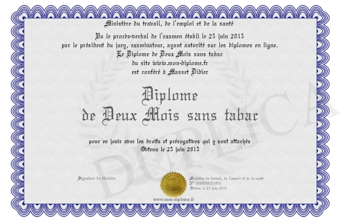 Envoyez par email votre Diplome de Deux Mois sans tabac personalisé