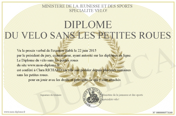 Envoyez par email votre Diplôme du vélo sans les petites roues personalisé