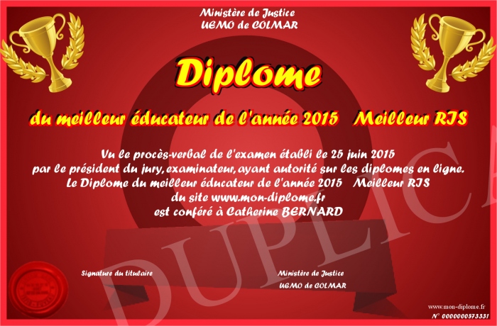 Envoyez par email votre Diplôme du meilleur éducateur de l'année 2015 Meilleur RIS personalisé