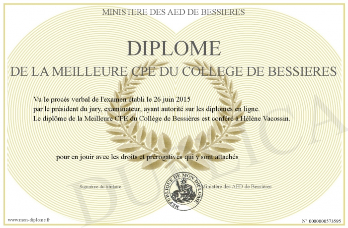 Envoyez par email votre Diplôme de la Meilleure CPE du Collège de Bessières personalisé