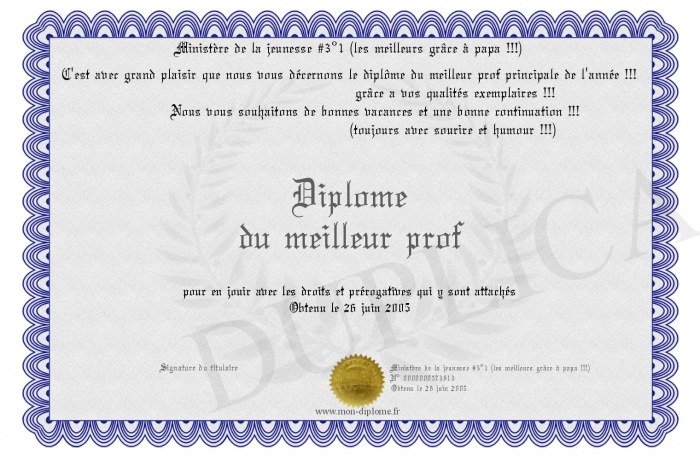 Envoyez par email votre Diplôme du meilleur prof personalisé