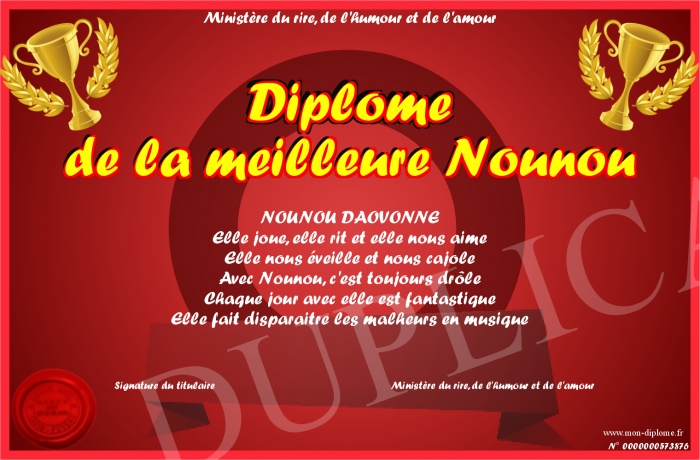Envoyez par email votre Diplome de la meilleure Nounou personalisé