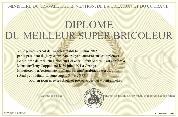 Envoyez par email votre Diplôme du meilleur Super Bricoleur personalisé