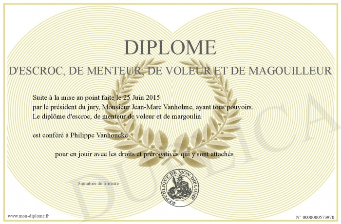 Envoyez par email votre Diplôme d'escroc, de menteur, de voleur et de magouilleur personalisé