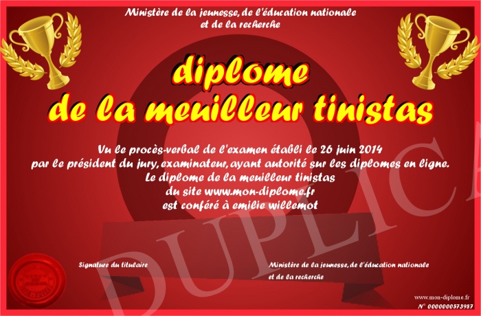 Envoyez par email votre diplome de la meuilleur tinistas personalisé