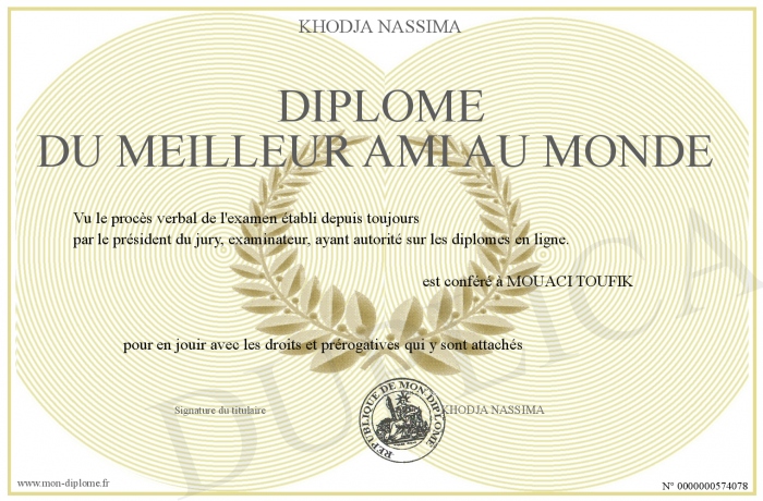 Envoyez par email votre Diplôme du meilleur ami au monde personalisé